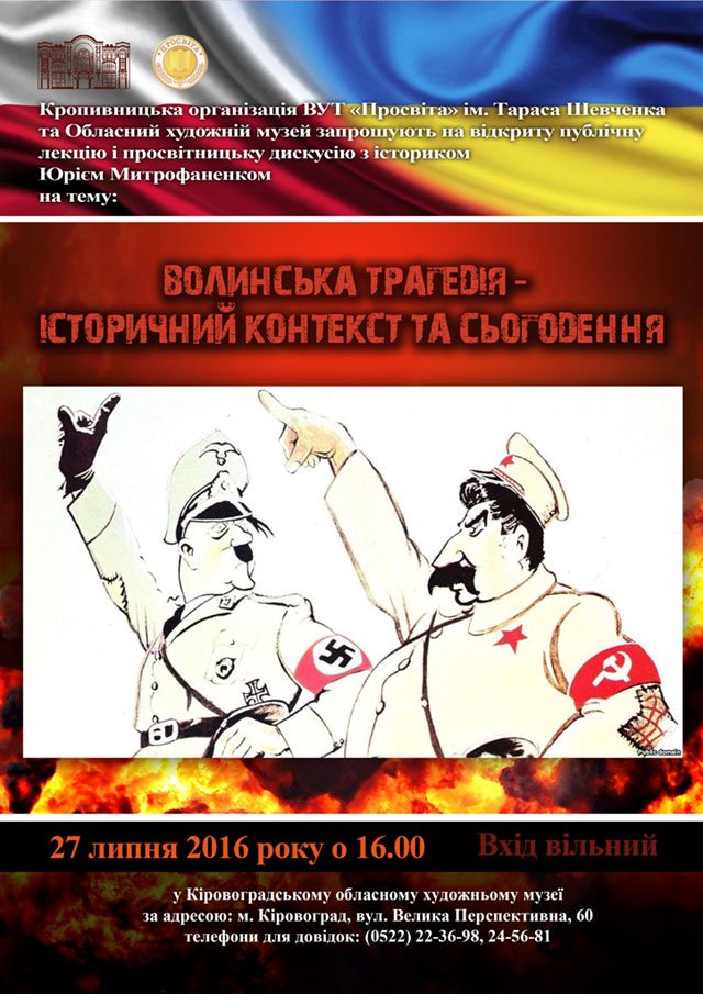 July 27, 2016 in the exposition hall of the Regional Art Museum by the initiative of the Kropyvnytskyi organization ВУТ «Просвіта» there was the open public lecture and discussion of education with a famous historian in our city, a candidate of historical sciences, a restless laborer in patriotic and educational field Yuriy Mitrofanenko on the theme "Volyn tragedy ? the historical context and present".