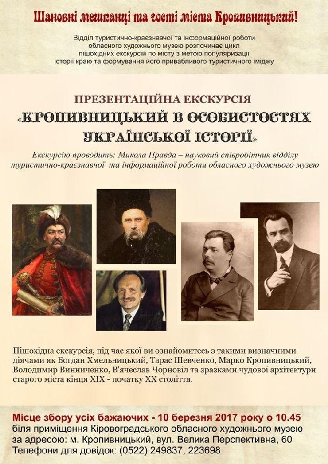 10 березня 2017 року в рамках запланованої обласним художнім музеєм серії тематичних екскурсій по місту співробітники відділу туристично-краєзнавчої та інформаційної роботи презентували небайдужим до історії рідного краю громадянам новий екскурсійний маршрут «Кропивницький в особистостях української історії».