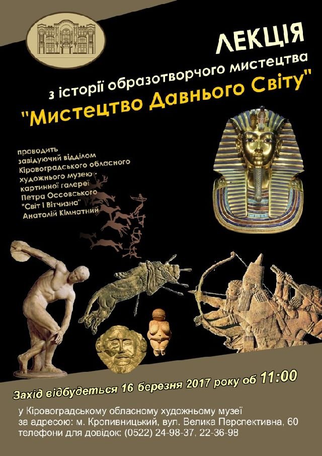 16 березня 2017 року у відділі обласного художнього музею - картинній галереї Петра Оссовського відбулась лекція з історії мистецтва під назвою "Мистецтво Давнього світу".