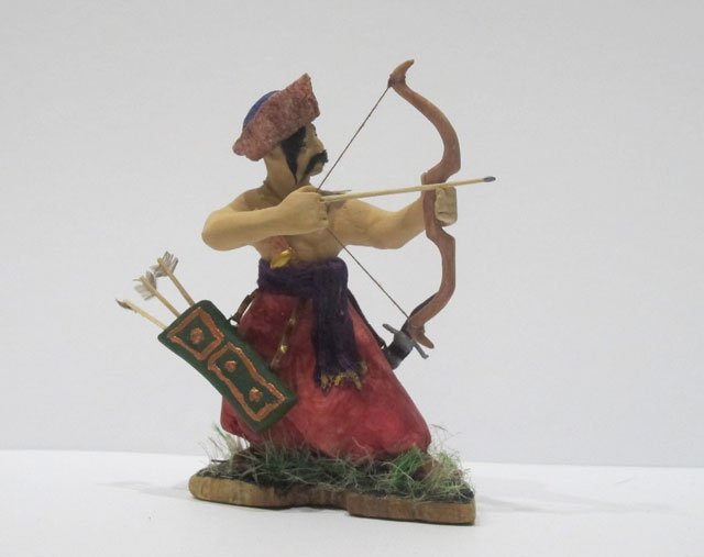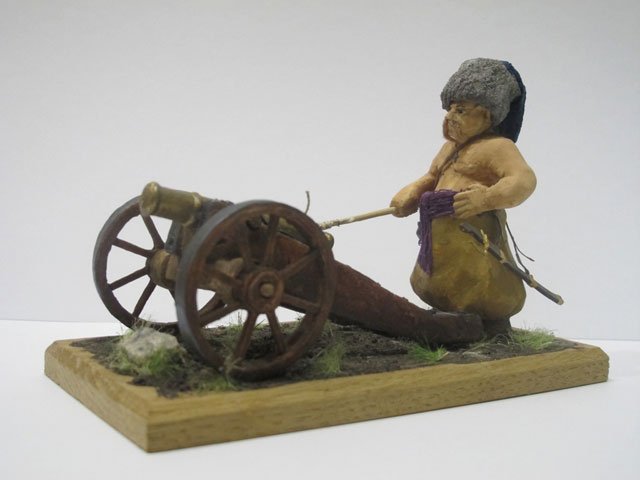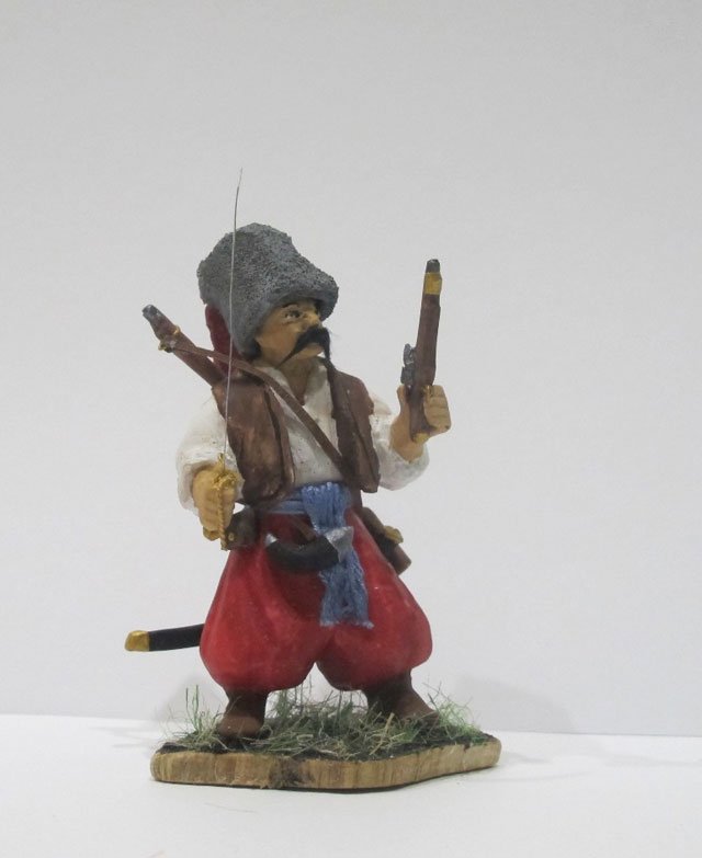 There are more than 50 miniatures from foam plastics that are painted in watercolor and gouache and placed on wooden supports. In the manufacture of miniature weapons of Cossacks Volodymyr uses wood and metal, for the gear (belts) he uses the treated tissue. For hair, mustache, horse manes and tails he uses the thread. When making miniatures other natural materials are used - ground, branches of trees, stones and sand. The height of walking figures is in average 7.8 cm., of a figure on horse – up to 15 cm.
