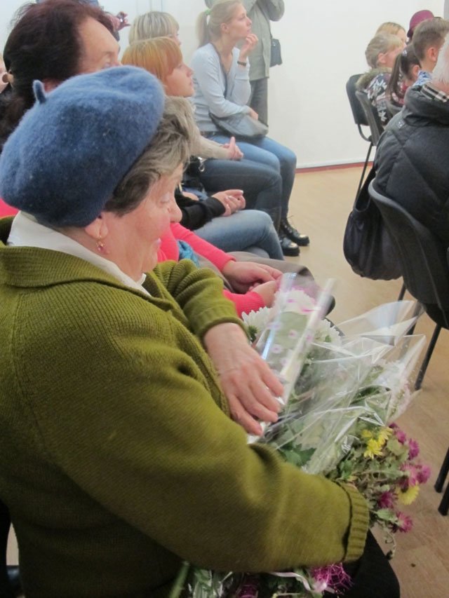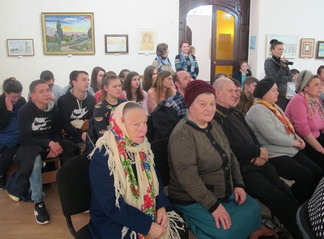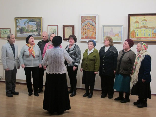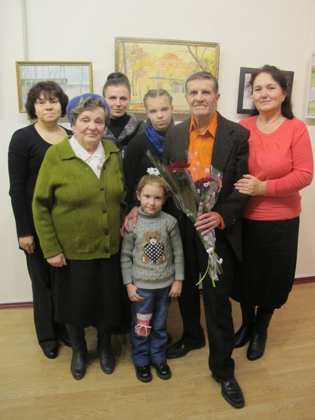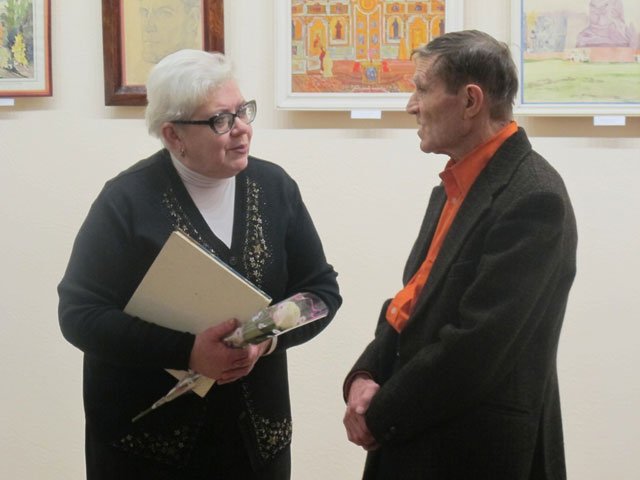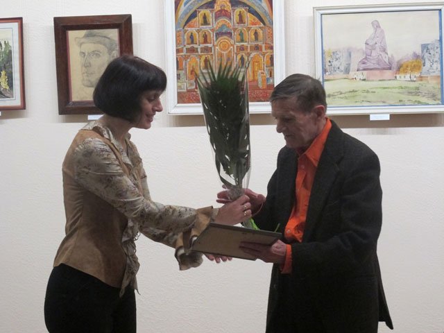 Family, friends and colleagues of Anatolii Suziumov visited the exhibition opening. During the grand exhibition opening the congratulations speech was given by the chief editor of the "Central Ukrainian education" newspaper Valentyna Bazhan, who thanked Anatolii Yehorovych for his creative achievements, fruitful cooperation and wished many years of creative activity to the anniversary celebrant. The member of the Ukrainian National Folk art Union Viktor Luhanshchuk addressed the artist with the warm and sincere words of support. The poet Tetiana Berezniak read greeting poems. And the warmest greetings were from the concert group "Otrada" led by Klavdiia Ariehieva who performed for the hero of the day and their leading singer the song "Meeting of friends"