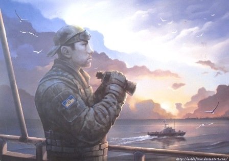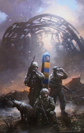 The presented works at the exhibition are primarily a hymn to those, who was the first to take the blow of Russian occupational bands on the land and at the sea. Among them - "Border 1", "Border 2", "Border 3", "Frontier 4" (Olexiy Zaharchenko - Lugansk border detachment, Oleg Nimchuk - Lviv border detachment), "Protecting the border", "Here we stand" (the border guards of OBPK "The Rock", Mostysk border detachment), "Border guards" (Hladkov - Kharkiv border detachment, Roman Dumyak - Lugansk border detachment, now OKPP "Kyiv", Yaroslav Slyvynskyi - Mostysk border detachment), "Holding the Heaven" (Yuriy Kozlovskyi, Kramatorsk border detachment), "The Outpost" (the call sign "Ali", Donetsk border detachment), "The Maritime boundary" (Olexiy Kostiukov - Odessa border detachment), "Atoshnyk", "The border guard" (Roman Dumyak, OKPP Kyiv), "The Rock: Jarek" (Yaroslav Voytsytskyi of OBPK "The Rock", Mostysk border detachment), "The Wall", "Survived. Dawn".