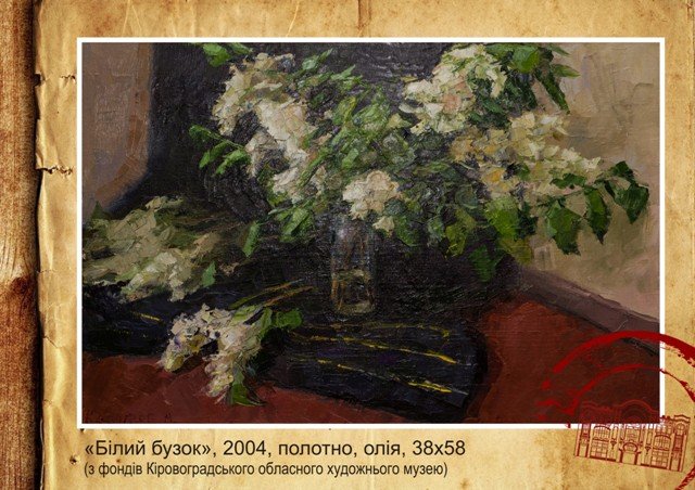 The works of young artist are kept in the collection of Kirovohrad regional art museum, Kirovohrad Art Memorial Museum of O.O. Osmerkin, in private collections of Ukraine, Czech Republic and France.