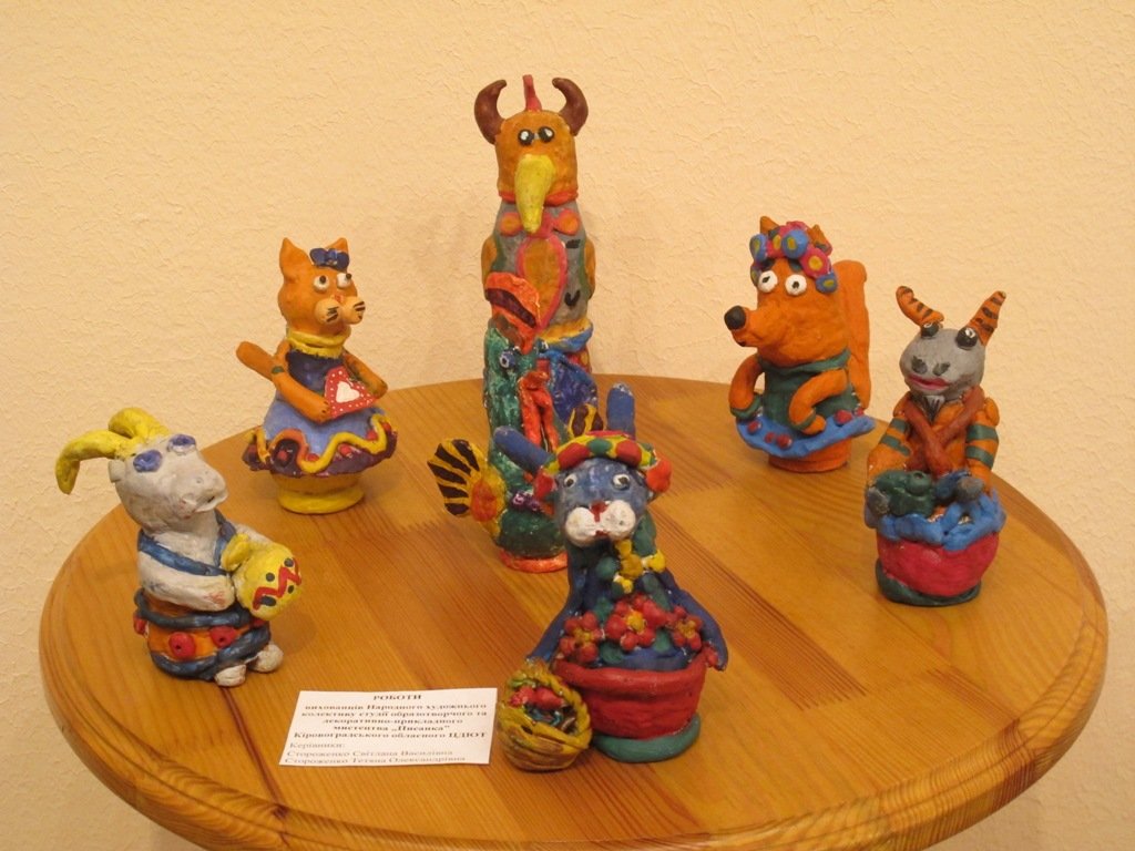 Almost for half a year the pupils of the studio "Pysanka" studied the life and work of Maria Oksentiyivna Pryimachenko and worked at creating their own fantastic wonder-animals, using their imagination and their own vision. The exhibition named "Enchanted Forest" presents 100 fairy drawings and 30 three-dimensional figures made of plasticine. In general, 120 children aged 6 to 14 years took park in the creation of the exhibition.