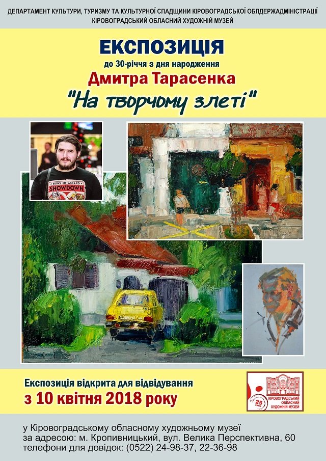 10 квітня 2018 року в обласному художньому музеї розгорнуто експозицію «На творчому злеті», присвячену творчості молодого самобутнього митця Тарасенка Дмитра Вікторовича, який 8 квітня цього року відзначив своє 30-річчя.