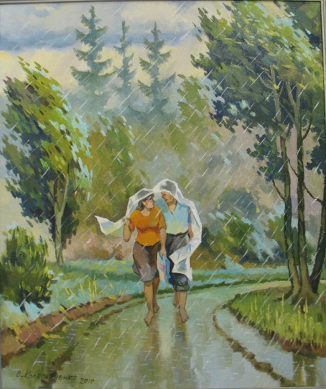 Works of the below mentioned talented artists continue to reveal all the varied emotions and feelings associated with the love, kisses and hugs. Particular attention is drawn to the graphics of Mykhailo Nadiezhdin "Couple" (1972) - the artist portrayed himself and his wife, and when you look at them, it seems that there are really only two lovers, special for one another and the very moment when around there is noone and the whole world can wait. Vitalii Kolesnichenko's picture "Let It Rain!" (2010) is copious of warmth and tenderness. Original artist Nadiia Padurska creates one more interesting image of lovers «Love» in «naive art» style.