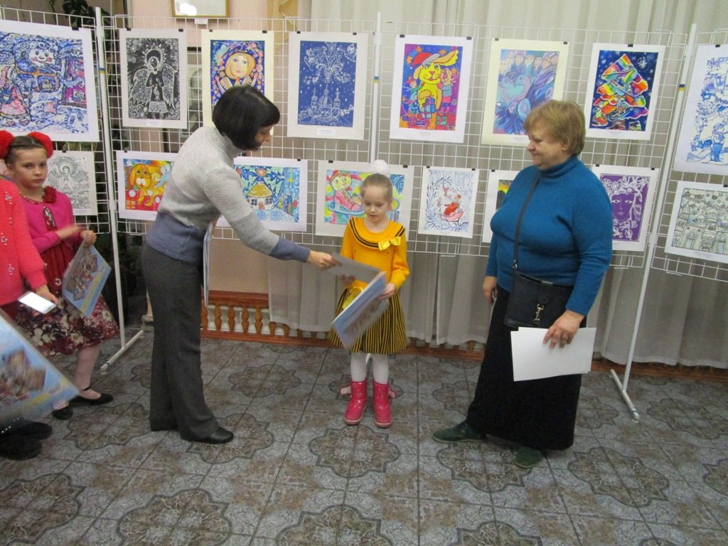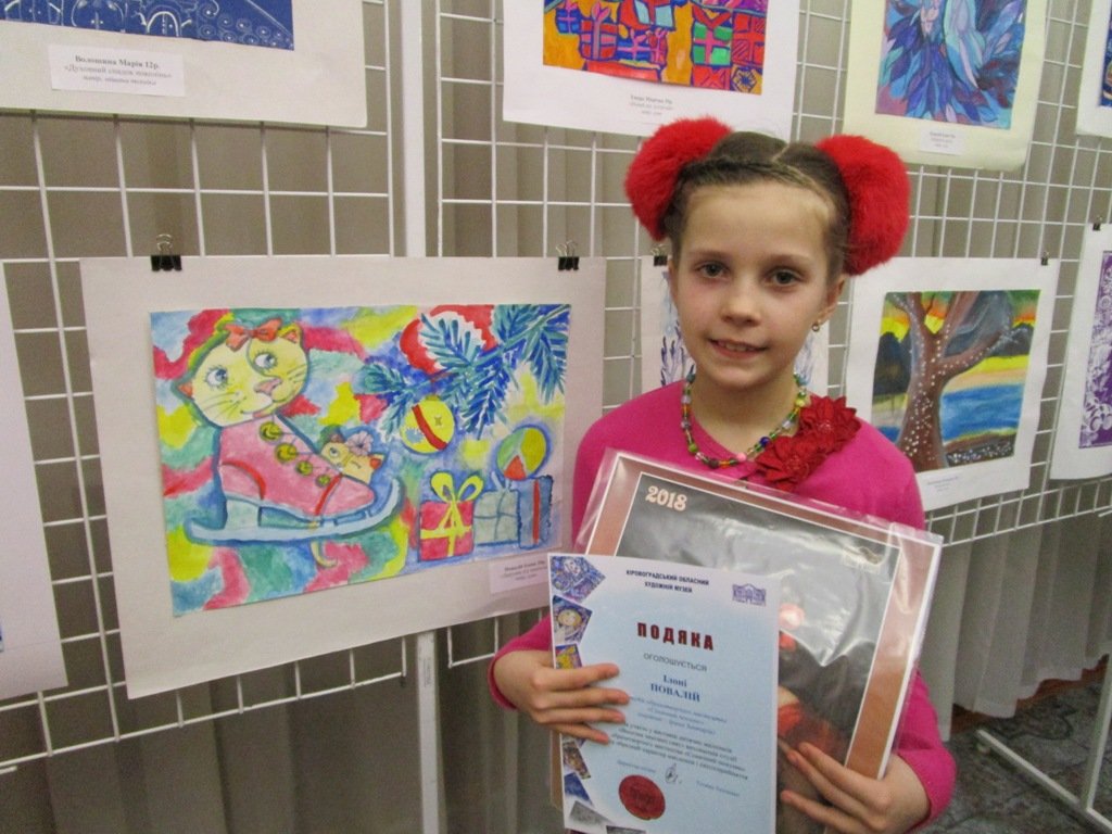 At this year's exhibition of paintings "Rainbow of winter holidays" the students of the art studio "Sunny Brush" are incredibly sincere, creative works made during 2017:the students of the art studio Kateryna Ivashchenko(7 years old), "Snow, light Snow " and "My Angel"; Ilona Povalii (10 years old), "Angelic Cradle", "Heavenly Lace", "Gifts for a Christmas tree", "Winter Fun" and "Blue Beauty"; Marichka Khmara(10 years old) «Koliad, koliad, koliadnytsia»(house-to-house caroling during Christmas), «Rainbow winter», «Meet the New Year», «New joy» and «Who loves Nicholas»; Mariia Voloshyna (12 years old) "Biblical Magi", "Christmas", "Warm Meeting", "Christmas Eve", "The spiritual inheritance of generations"; Sofiia (7 years old) "Joyful news", "Snow-white flowers of winter"; Kateryna Linovichenko (10 years old), "First snow", "Yellow dog year" and "A bright festive day".