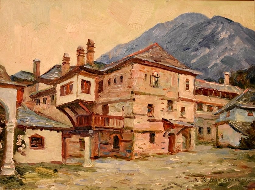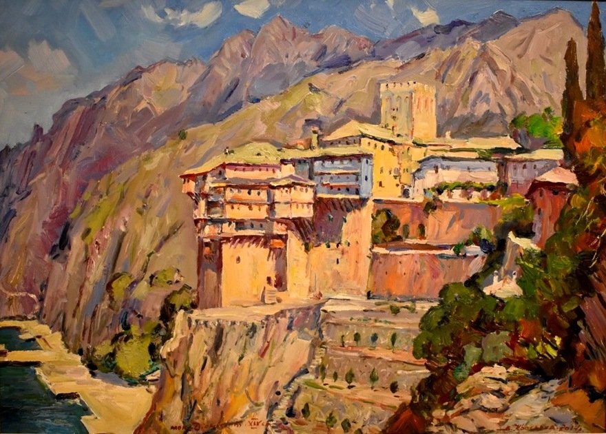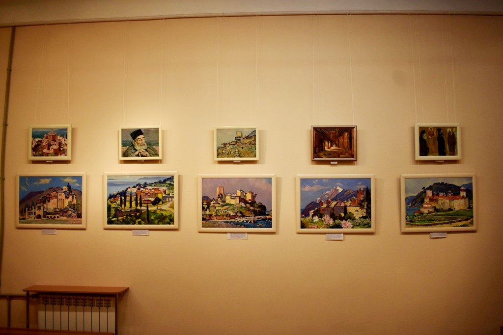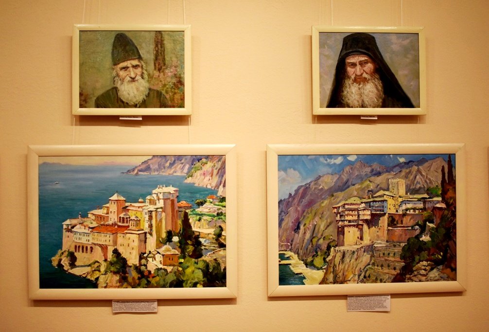 В експозиції представлено двадцять одну живописну роботу із зображенням 21 монастиря Афону: «Карея. Собор Протата», «Монастир Велика Лавра», «Монастир Ватопед», «Монастир Іверон», «Монастир Хіландар», «Монастир Діонісіат», «Монастир Кутлумуш», «Монастир Пантократор», «Монастир Ксиропотам», «Монастир Зограф», «Монастир Дохіар», «Монастир Каракал», «Монастир Філофей», «Монастир Симонопетра», «Монастир Св. Павла», «Монастир Ставронікіта», «Монастир Ксенофонт», «Монастир Григоріат», «Монастир Есфігмен», «Монастир Св. Пантелеймона», «Монастир Констамоніт».