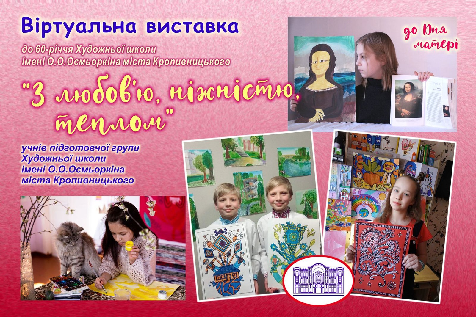 Напередодні святкування Дня Матері в Україні Кіровоградський обласний художній музей презентує віртуальну виставку «З любов’ю, ніжністю, теплом» учнів підготовчої групи художньої школи імені О.О.Осмьоркіна м. Кропивницького (викладач - відмінник освіти України Ірина Зантарія).