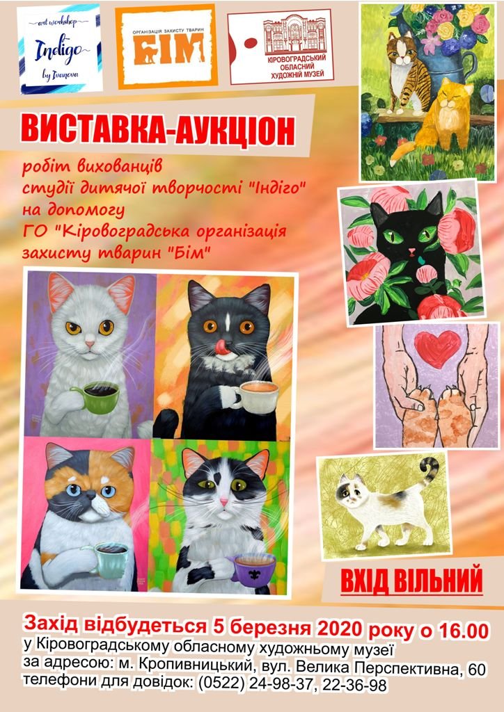 5 березня 2020 року в Кіровоградському обласному художньому музеї відкрилася виставка-аукціон робіт вихованців студії дитячої творчості «Індіго» на допомогу ГО Кіровоградська організація захисту тварин «Бім».