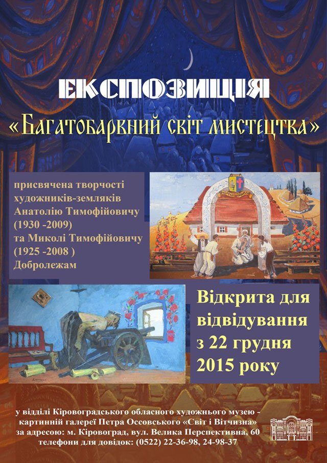 22 грудня 2015 року у відділі Кіровоградського обласного художнього музею – картинній галереї Петра Оссовського «Світ і Вітчизна» відкрито виставку, присвячену творчості художників-земляків: 85-річчю з дня народження Анатолія Тимофійовича Добролежі та 90-річчю – Миколи Тимофійовича Добролежі.