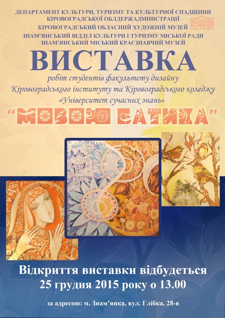 25 грудня 2015 року в рамках продовження творчої співпраці Кіровоградського обласного художнього музею та Знам’янського міського краєзнавчого музею було відкрито виставку робіт «Мовою батика» студентів факультету дизайну Кіровоградського коледжу та Кіровоградського інституту регіонального управління та економіки ВНЗ «Університет сучасних знань».
