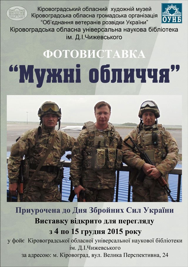 З 4 грудня по 15 грудня 2015 року у співпраці Кіровоградського обласного художнього музею та Кіровоградської обласної організації «Об’єднання ветеранів розвідки України», яку очолює підполковник у відставці В’ячеслав Кузьмович Іванов, у фойє Обласної універсальної наукової бібліотеки імені Д.І.Чижевського було розгорнуто фотовиставку «Мужні обличчя», приурочену Дню Збройних Сил України.