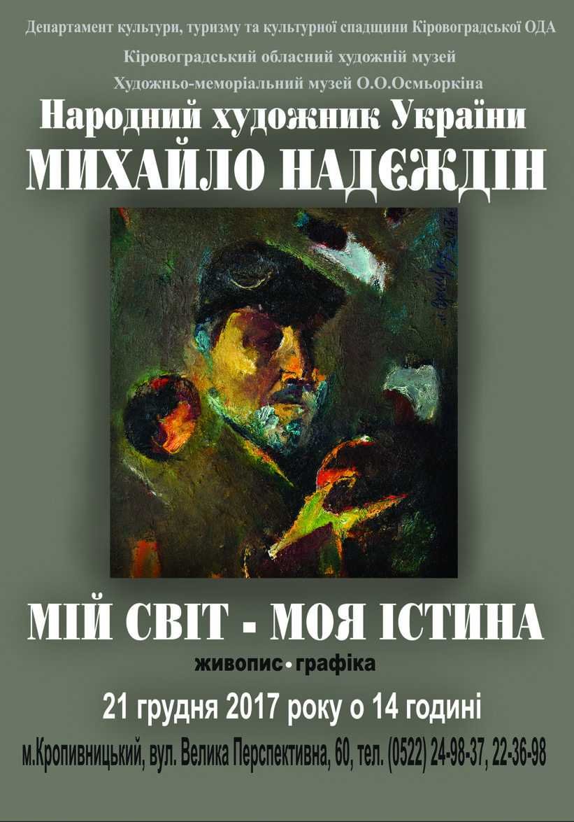 21 грудня 2017 року в Кіровоградському обласному художньому музеї відбулося відкриття виставки живописних та графічних робіт «Мій світ - моя істина» народного художника України Михайла Надєждіна. Виставка присвячується 55-й річниці творчої діяльності художника та 20-річчю з часу присвоєння митцю почесного звання «народний».