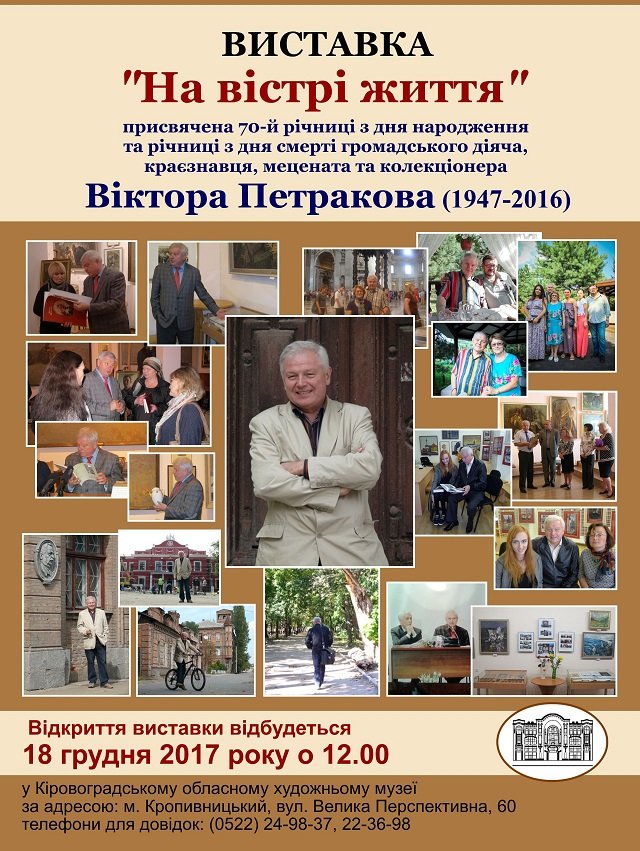 18 грудня 2017 року у відділі обласного художнього музею – картинній галереї Петра Оссовського «Світ і Вітчизна» відкрито виставку «На вістрі життя», присвячену світлій пам’яті громадського діяча, краєзнавця, мецената та колекціонера Віктора Петракова.