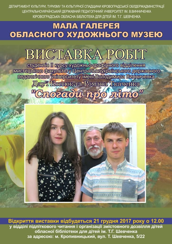 21 грудня 2017 року в Малій галереї Кіровоградського обласного художнього музею – у відділі підліткового читання і організації змістовного дозвілля дітей обласної бібліотеки для дітей ім. Т.Г.Шевченка відбулося відкриття виставки робіт студентів ІІ курсу художньо-графічного відділення мистецького факультету Центральноукраїнського державного педагогічного університету імені Володимира Винниченка Дар'ї Костюк та Романа Ткаченка «Спогади про літо».