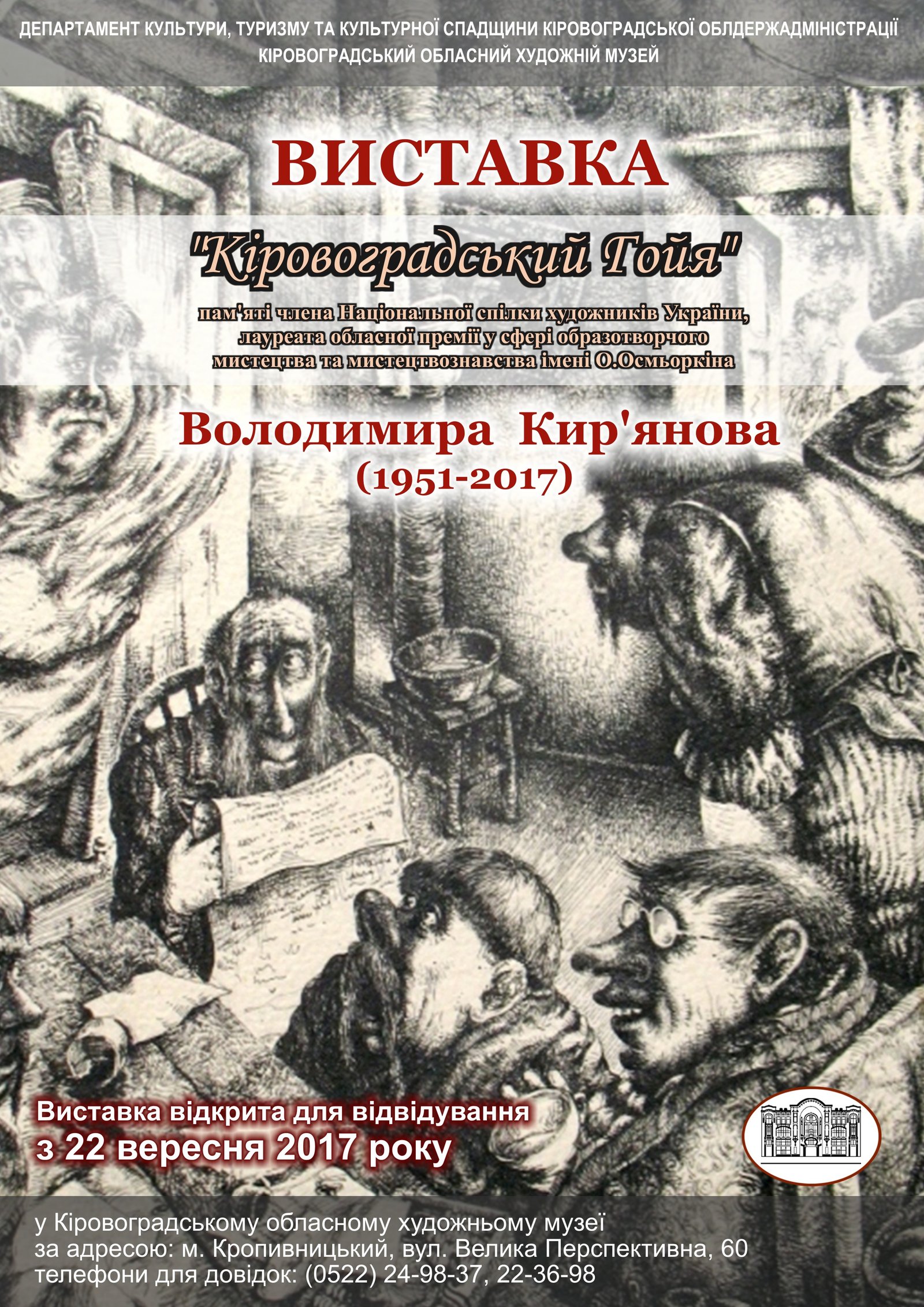 22 вересня в обласному художньому музеї розгорнуто виставку «Кіровоградський Гойя», присвячену світлій пам’яті унікального та самобутнього художника-земляка, члена Національної спілки художників України, лауреата обласної премії у сфері образотворчого мистецтва та мистецтвознавства імені Олександра Осмьоркіна Володимира Васильовича Кир’янова, яскравий талант, безмежна творча фантазія та незаперечна геніальність якого стали невід’ємною і дуже важливою складовою мистецького життя Степової Еллади, а особливість творчого мислення дали привід шанувальникам робіт художника називати його «наш кіровоградський Гойя».