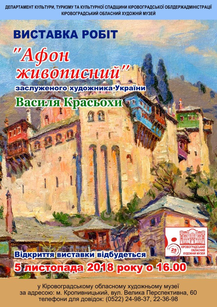 5 листопада 2018 року в Кіровоградському обласному художньому музеї відбулося відкриття виставки живописних робіт «Живописний Афон» заслуженого художника України, члена Національної спілки художників України Василя Красьохи.