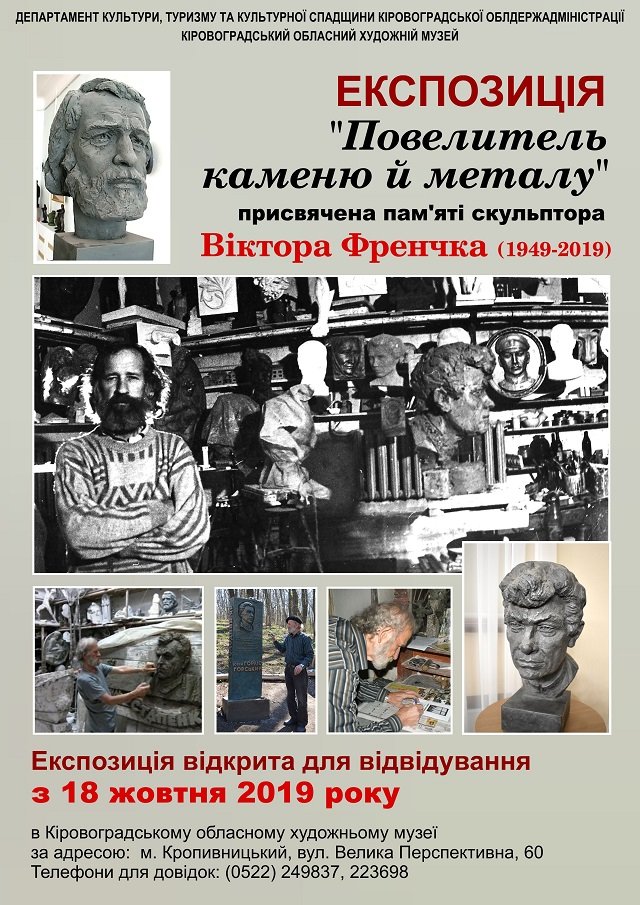 18 жовтня 2019 року в обласному художньому музеї розгорнуто експозицію «Повелитель глини і каменю» світлої пам’яті видатного скульптора, члена Національної спілки художників України, лауреата обласної премії у сфері образотворчого мистецтва та мистецтвознавства імені Олександра Осмьоркіна у номінації «Національна традиція» Френчка Віктора Васильовича (1949-2019).