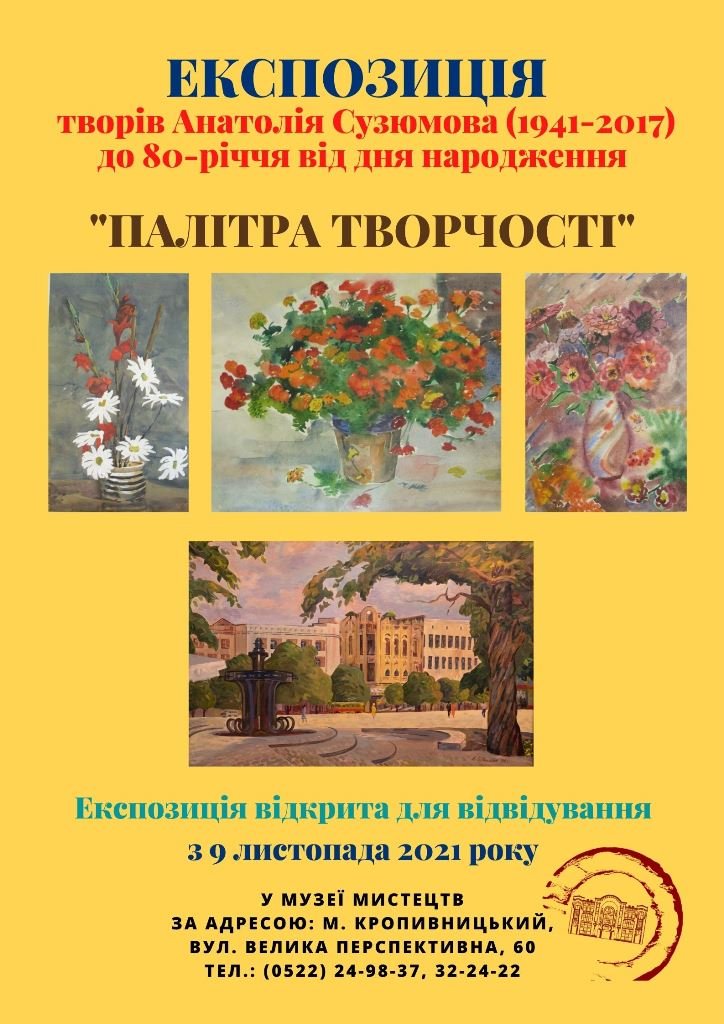 9 листопада 2021 року в Музеї мистецтв розгорнуто експозицію художніх творів Анатолія Єгоровича Сузюмова (1941-2017) «Палітра творчості» до 80-річчя з дня народження.