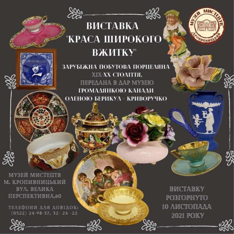 10 листопада 2021 року у КЗ «Музей мистецтв Кіровоградської обласної ради» була доповнена виставка зарубіжної побутової порцеляни ХІХ-ХХ століття, переданої громадянкою Канади Оленою Берикул-Криворучко: «Краса широкого вжитку», новими надходженнями.