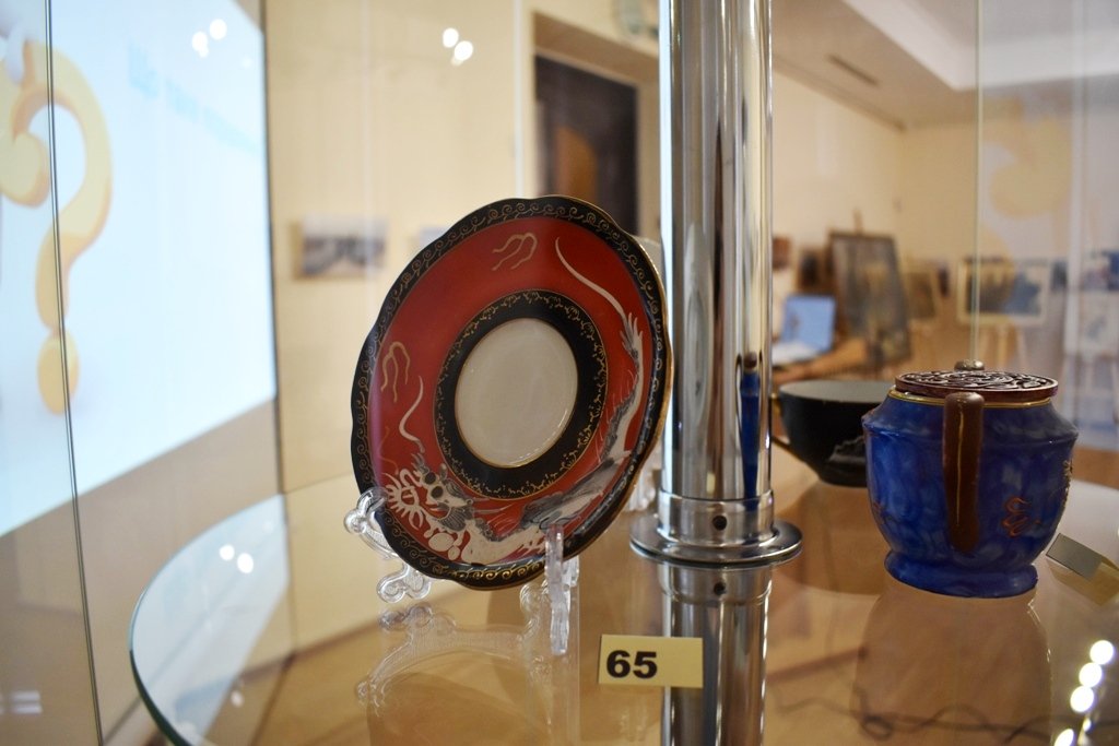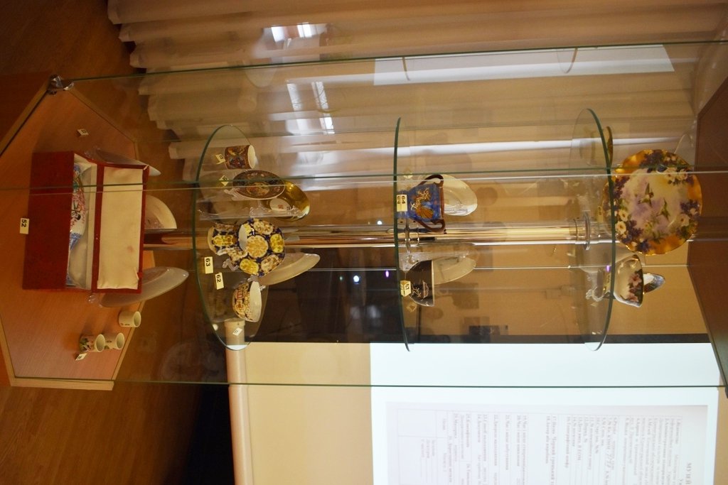 У колекції представлений посуд, статуетки, вази. Більшість виробів виготовлені з порцеляни і фаянсу, деякі з кераміка та скла. Серед виробів представлено японську вазу з квітами, що виготовлена з порцеляни - бісквіт (різновид кераміки, неглазурована порцеляна, виріб з білого порцелянової маси, не покритий блискучим шаром свинцевої глазурі). Інша ваза – китайська і вироблена у місті Дзіндечжен - центрі виробництва порцеляни у Китаї. Особливістю даного виробу є його легкість, адже матеріал з якого вона зроблена - це яєчна порцеляна. Велика кількість робіт виконана у техніці моріаж (на поверхню порцеляни наносять тонкі смужки пофарбованої глини для створення ефекту тривимірності (3D)): цукорниця «Дракон», набір для чаю «Острів», блюдце «Дракон» та інші. Деякий посуд виготовляли у стилі шинуазрі – це стиль, в якому західноєвропейські митці поверхнево відтворювали незнайомі їм образи людей і природи Китаю. Стиль залишався популярним понад 200 років. Свій внесок в популярність шинуазрі зробила і мода на чаювання, що виникла в цю добу - набір для чаю «Троянди в зеленому обрамлені», набір для кави «Хризантеми».