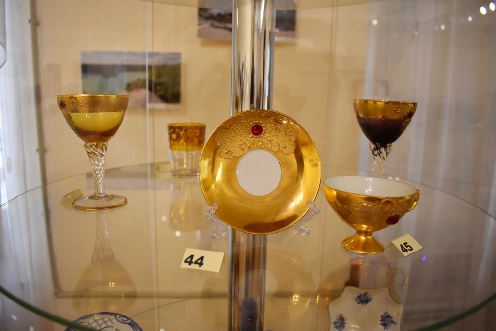 Ще одна статуетка «Жовта квітка» - прикраса для весільного столу. Раніше такі квіти виготовляли з кераміки чи порцеляни та декорували святковий стіл. Велика кількість посуду розписана вручну, а деякі навіть мають авторський розпис: тарілка «Колібрі» та чайний набір «Колібрі» авторки Ліни Лію, тарілка «Сойки» художника Кевіна Даніеля.