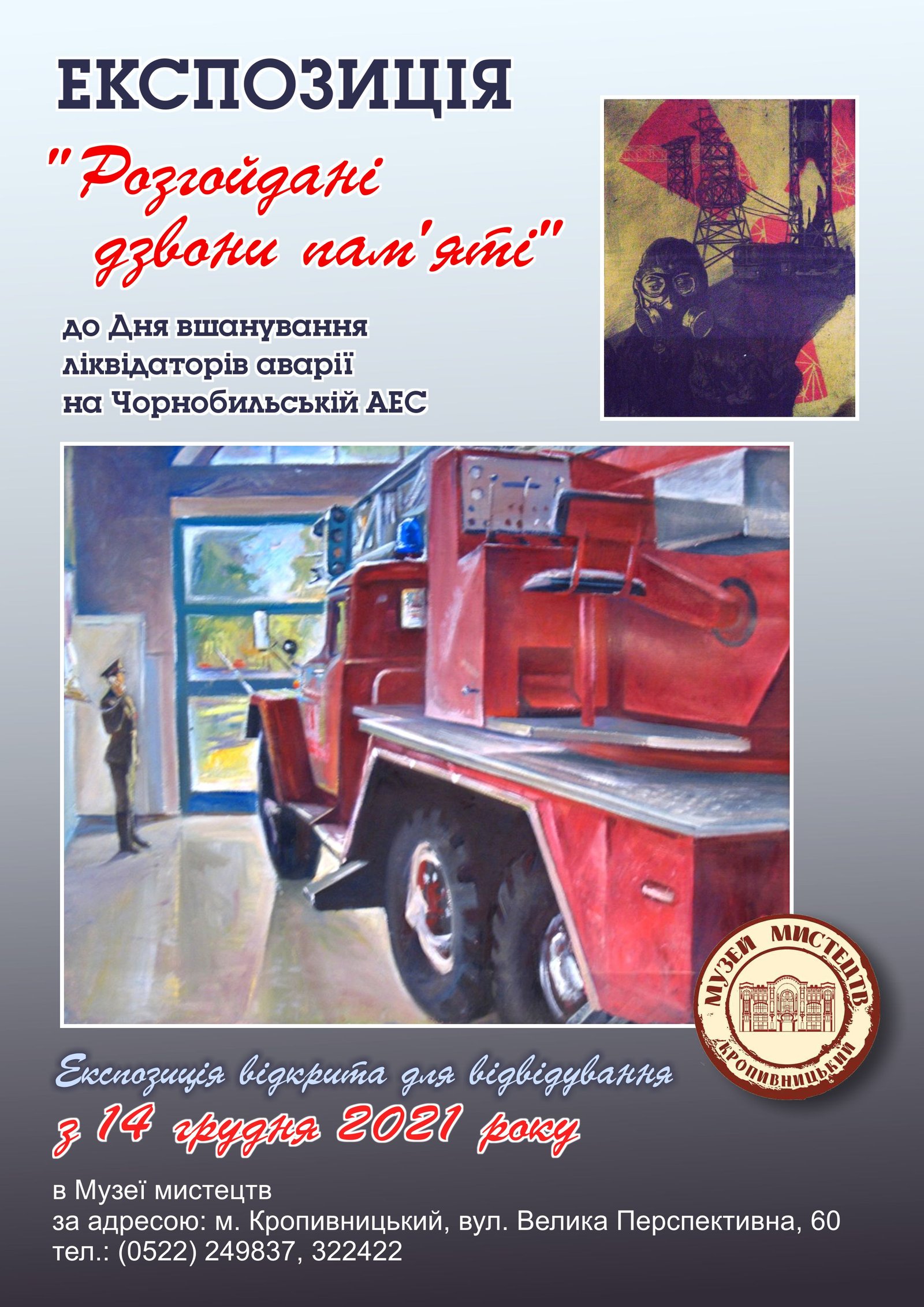 14 грудня 2021 року в КЗ «Музей мистецтв Кіровоградської обласної ради» розгорнуто експозицію «Розгойдані дзвони пам’яті» до Дня вшанування учасників ліквідації наслідків аварії на Чорнобильській АЕС.