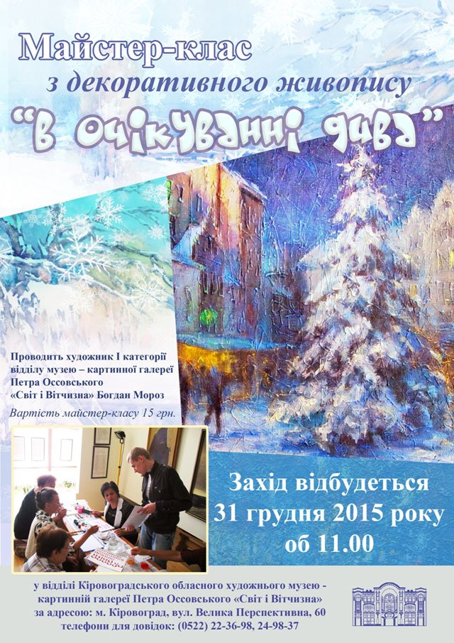 31 грудня 2015 року у відділі Кіровоградського обласного художнього музею - картинній галереї Петра Оссовського «Світ і Вітчизна», у рамках «Творчої майстерні» був проведений майстер-клас з декоративного живопису «В очікуванні дива».