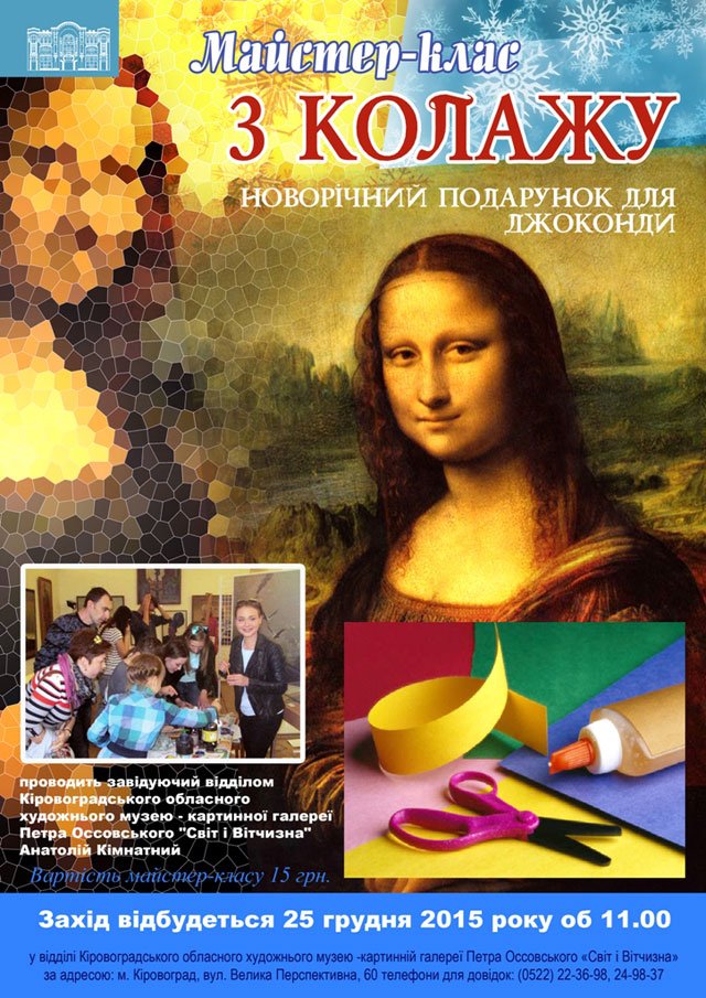 25 грудня 2015 року у відділі Кіровоградського обласного художнього музею – картинній галереї Петра Оссовського «Світ і Вітчизна» було проведено майстер-клас з колажу «Новорічний подарунок для Джоконди».