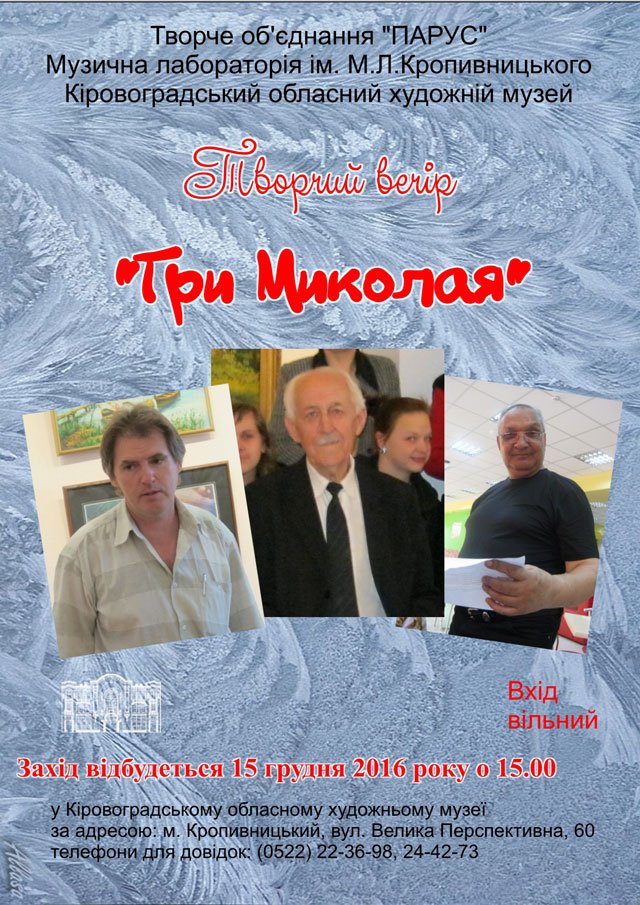 15 грудня 2016 року в рамках роботи «Музичної вітальні» в Кіровоградському обласному художньому музеї відбувся творчий вечір під назвою «Три Миколая».