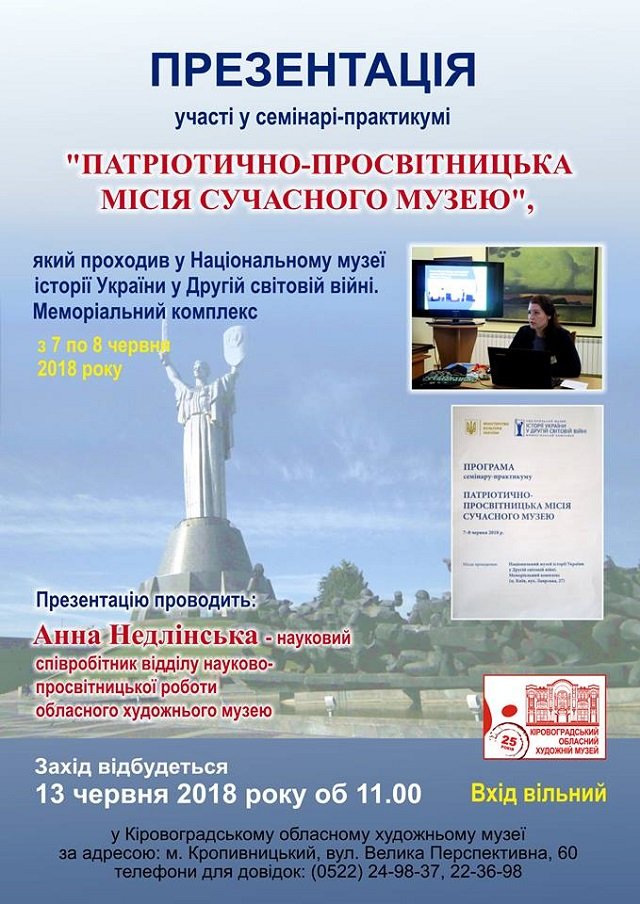 Відбулася презентація участі в семінарі-практикумі "Патріотично-просвітницька місія сучасного музею", що проходив 7-8 червня 2018 року в Національному музеї історії України у Другій світовій війні (м. Київ).